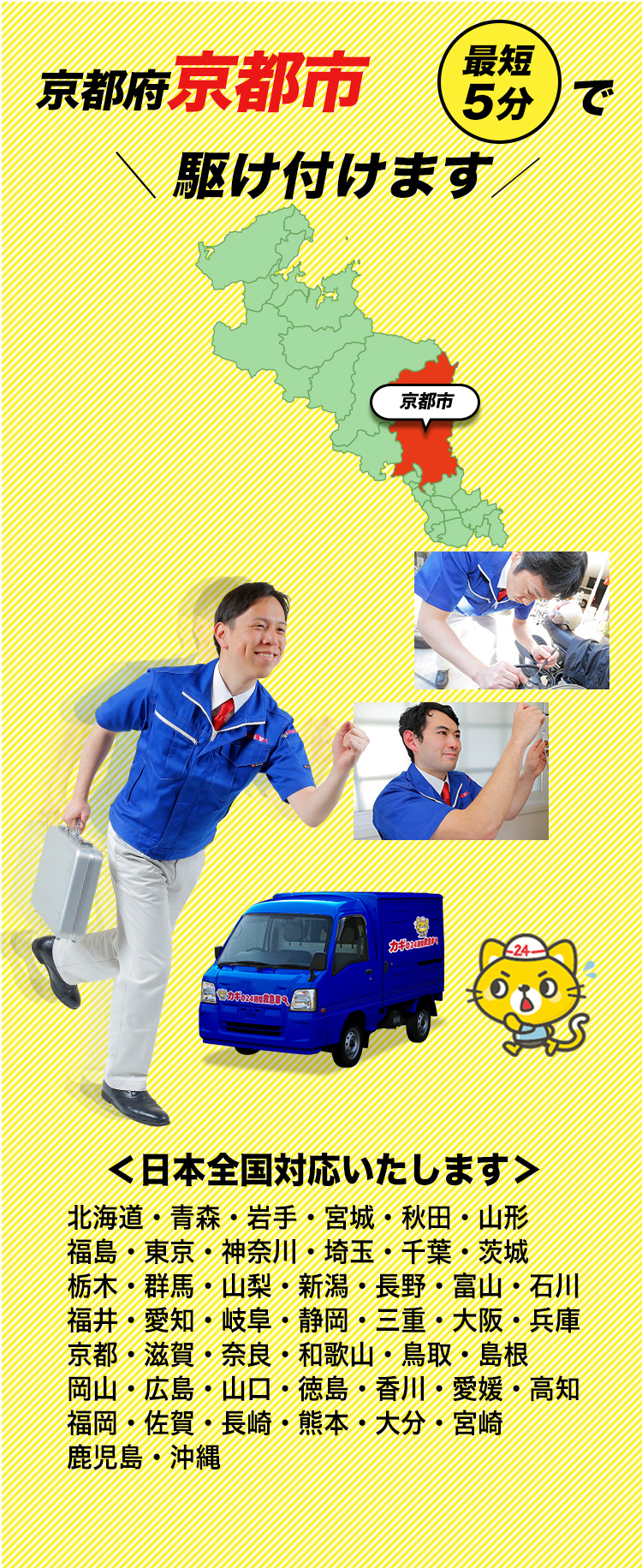 京都の「カギの出張24時間」は、古都の風情を感じる場所での鍵の緊急対応にも迅速に対応します。観光客も安心の多言語サポートを提供し、作業前の丁寧な説明でお客様の不安を解消。京都で鍵の問題があれば、当店にお任せください。